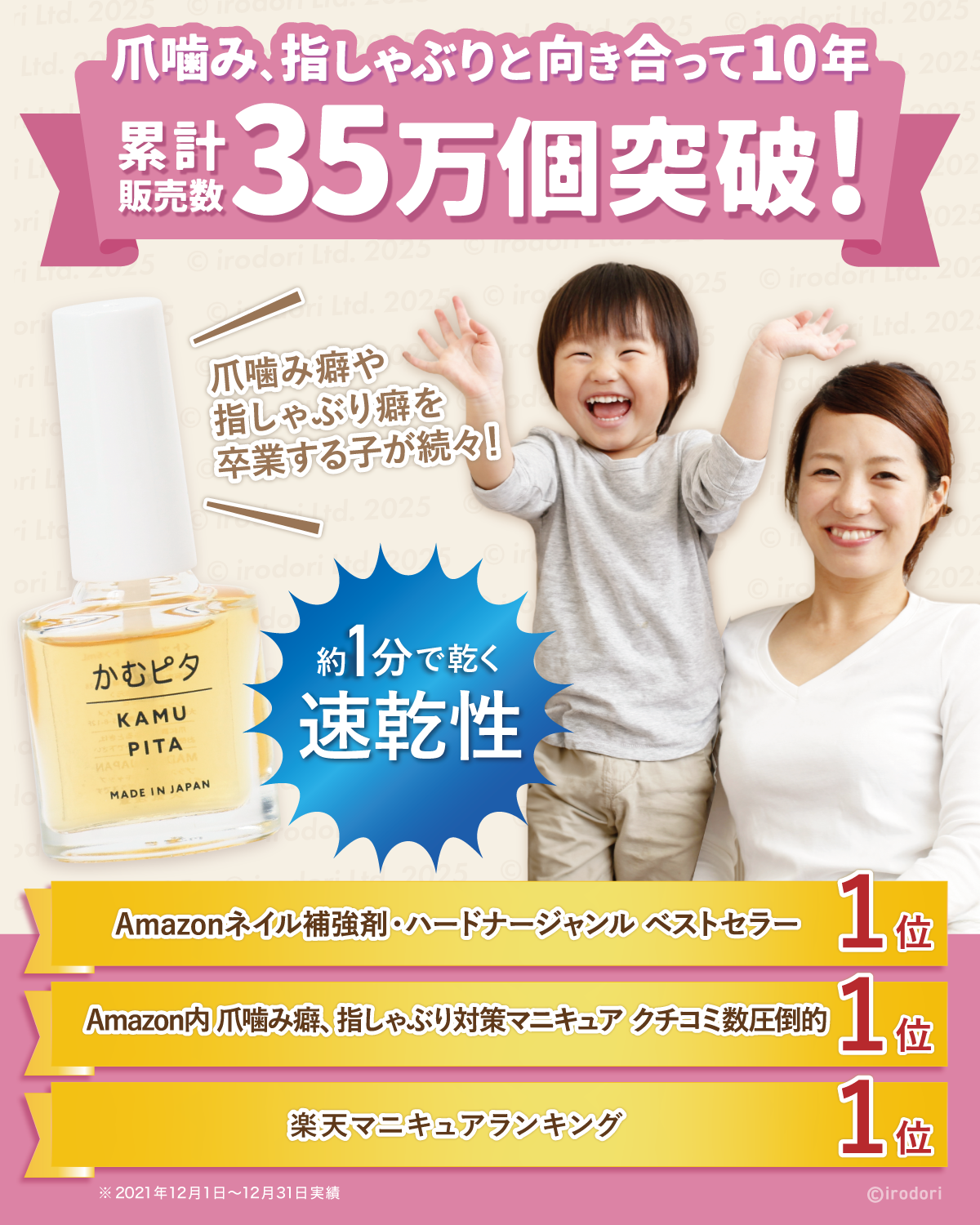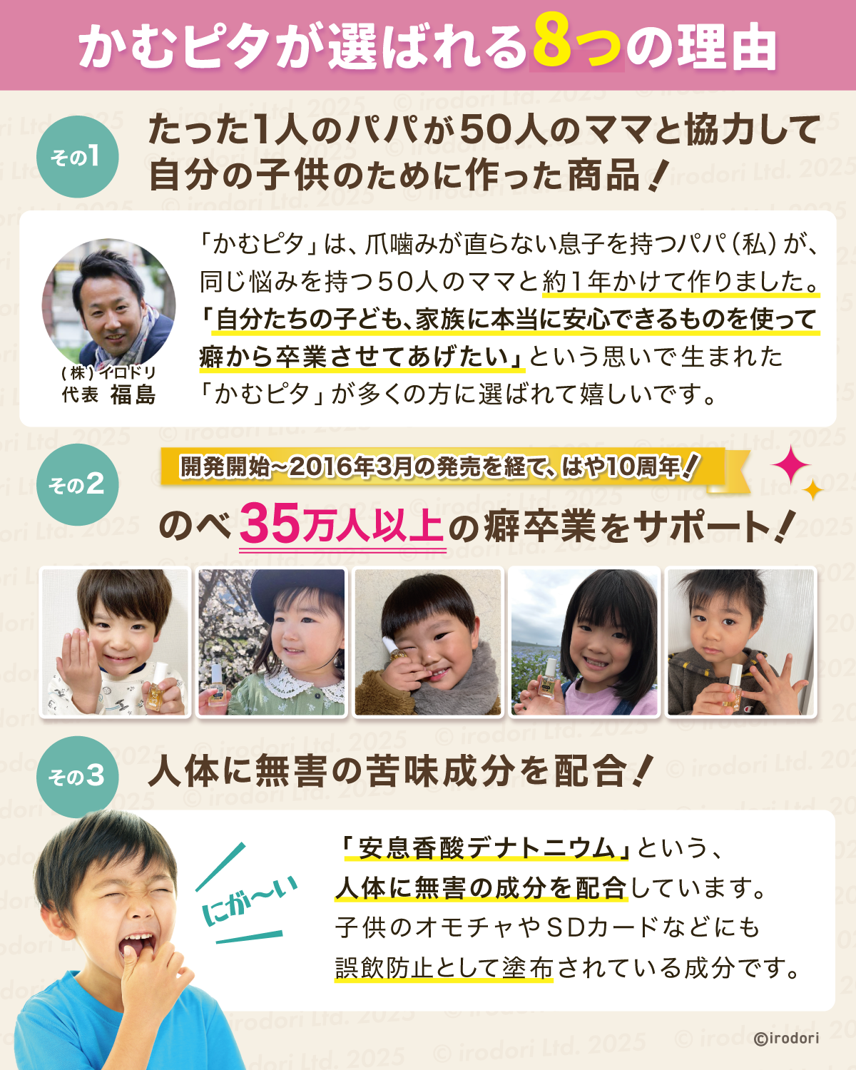 爪噛み癖がある小学生の男の子のパパ(当社の社長)と、爪噛み癖や指しゃぶり癖など同じ悩みを持つ50人のママの声から生まれた日本製でオーガニックな植物由来の成分を配合した、子どもに優しい苦いマニキュアです。